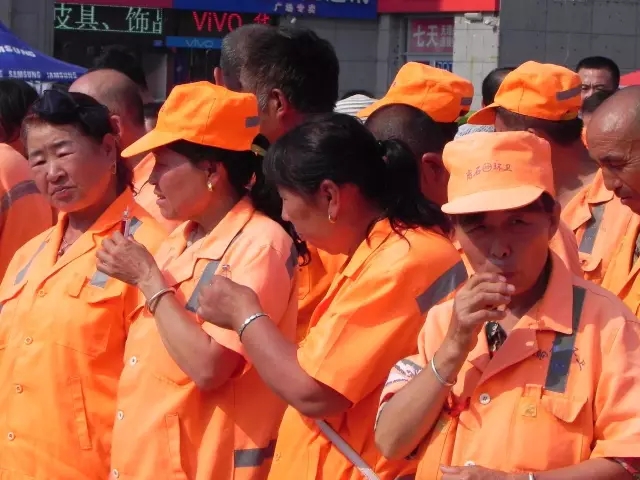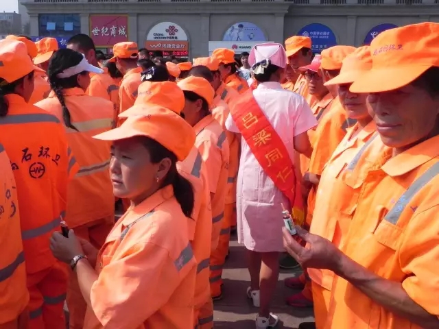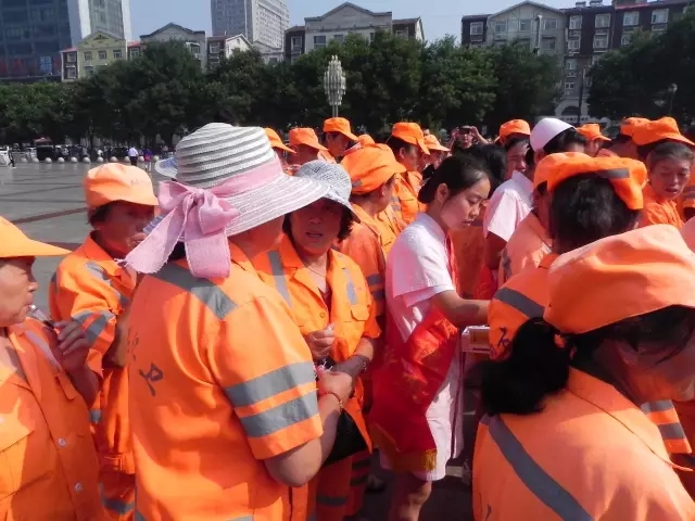 圖為:環(huán)衛(wèi)工人正在品嘗山西同仁康大藥房送上的藿香正氣口服液